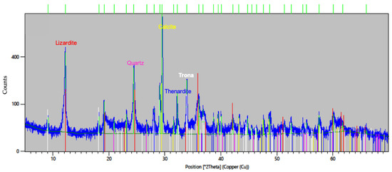 The XRD (Table 1 and Figure 6) analyses of the efflorescence show the presence of salts such as trona [(Na3(CO3) (HCO3) 2(H2O)] and/or thenardite (Na2SO4). The sample EF 6 contains a very small quantity of gypsum [(CaSO4·2(H2O)]. The XRD analyses also revealed the presence of lizardite, coming from the underlying serpentinite, calcite, quartz and feldspar coming from the mortar holding the green tiles together, and from the surrounding tiles. The efflorescence is not visible on the surface of the other rocks used on the floor; analyses were made also on powders scraped from the marble and limestone, but we found only calcite and gypsum on the marble, calcite, quartz, and gypsum on the red limestone. The EF 7 sample was collected from the SE serpentinite wall. In addition to trona, in this sample also niter (KNO3) and darapskite [Na3(NO3) (SO4)·H2O)] were detected.
