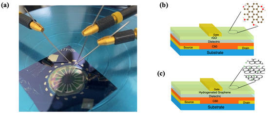 OTFT environmental sensor. (a) Photographic image of a solution processed C60 OTFT device under test. (b) rGO-based OTFT humidity sensor architecture. (c) Hydrogenated graphene-based OTFT Cl− sensor architecture.