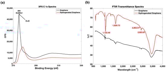 Both graphene and in-house synthesized hydrogenated graphene materials were observed using XPS and FTIR, and the peaks in the respective spectra were examined and analyzed. Confirmation of hydrogenation of the graphene was observed in both the XPS and FTIR spectra, as shown in Figure 3a,b. Hydrogenation was confirmed in the XPS spectra where a shift in the C1s spectra is visible from ~284 eV in graphene to ~287 eV in hydrogenated graphene. The peak value in the C1s spectrum (~284 eV) of the tested graphene sample is comparable to the peak values of the spectra reported in literature for pristine graphene [22]. Given that XPS cannot distinguish C–H and C–C bonds, the FTIR transmittance spectra comparison of both graphene and hydrogenated graphene was then used to confirm sp3 C-H hybridization peaks due to C-H stretching vibrations at wave number ~2852.51 cm−1 and ~2923.87 cm−1, and an intense C-H bending peak at ~1122.49 cm−1 on hydrogenated graphene and relatively weaker or completely non-existent on graphene. Using fluorographite as a starting material instead of graphite or graphite oxide contributes to a highly hydrogenated product as, according to a mechanism by Yang et al., the tertiary C-F bond domains are the principal structure of the fluorographite and these can be easily reduced. We can conclude that tertiary C-F bonds in fluorographite were all transformed into C-H bonds as well as C-C π-conjugated domains, but it should be noted that the latter domains form the minor structure of fluorographite [20]. A stronger C-C skeletal vibration at ~1629.73 cm−1 for HG compared to the one on graphene can mean the destruction/displacement/removal/utilization of the C=C during the reduction process and further analysis and or study is beyond the scope of this study. For purposes of this study we have confirmed hydrogenation.