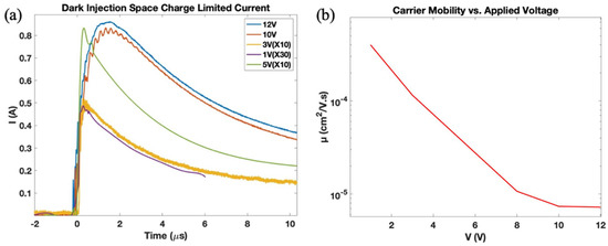 Charge mobility characterization: (a) SCLC current transient, (b) measured charge mobility vs. applied voltage.