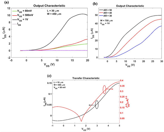 OTFT electrical characterization results: (a) Output characteristic at constant gate bias VGS range from 80 mV to 1 V, (b) parametric sweep of output characteristic against OTFT aspect ratio at VGS = 1 V, (c) transfer characteristic at VDS = 50 mV where IDS and √IDS are used for estimating threshold voltage, carrier mobility, and current ON/OFF ratio.