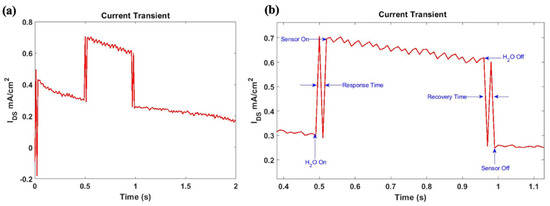 In this instance, the OTFT gate was functionalized with rGO which undergoes an increase in conductivity in the presence of water molecules. The sensor’s transient response was measured at a constant gate bias of 1 V and drain voltage of 5 V at which the OTFT operates in the linear regime. The current transient of the sensor is depicted in Figure 7a, which displays the sensors response before, during, and after exposure to high levels of humidity.