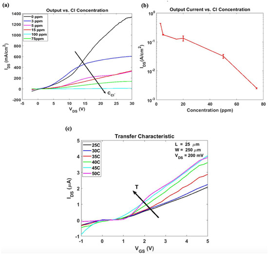 As previously described, the chloride sensor is composed of the C60 OTFT in which the gate conductive layer was functionalized with hydrogenated graphene. The sensing performance of the fabricated OTFT chloride sensor against a broad range of chloride ion concentrations is evaluated and compared to the core OTFT device comprising Gr: PEDOT:PSS as the gate conductive layer. Figure 8a displays the output characteristic of the chloride sensor before and after exposure to different Cl− concentrations (3 ppm −75 ppm) at a constant gate bias VGS = 1 V. As evident, the sensor undergoes a decrease in the saturation current associated with the decrease in conductivity resulting from hydrogenated graphene bonding with chloride ions. The output current was also measured at VDS = 13 V, during which the sensor operates in the linear regime. Transistors with varying channel lengths and aspect ratios were exposed to Cl− solution and their output current was measured. For all OTFT Cl− sensors, the output current density exhibits a logarithmic dependence over concentration ranging between 3 ppm and 75 ppm, as shown in Figure 8b. Transistor dimension variations do not affect responses to seen analytes, where changes in IDS remain consistent regardless of the sensor’s surface area. The sensor response experiences slight diversion after recurring measurements, often observed on organic electronics, but remains relatively uniform with respect to analyte concentration.