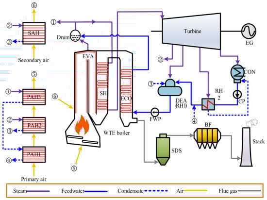 However, compared with conventional coal-fired power units (CFPUs), the energy efficiency of waste-to-energy units (WTEUs) is lower due to lower steam parameters, higher condensing pressure, higher auxiliary power consumption rate and more exhaust flue gas energy loss. The current behaviors to enhance the energy efficiency of WTEUs mainly focus on raising steam parameters and utilizing exhaust flue gas heat. The live steam temperature and pressure in waste-to-energy (WTE) boilers are usually designed at 400 °C and 40 bar, respectively []. Raising steam parameters can recover more energy of MSW and enhance power efficiency, while the high-temperature flue gas produced by MSW incineration could cause high-temperature corrosion of heat exchangers in WTE boilers [,]. Xu et al. [] introduced a new type of refractory brick to the combustion chamber, which delivers more heat, allows steam to superheat on waterwall, reduces corrosion risks and increases the WTEU efficiency. Martin et al. [] arranged an anti-corrosion radiation superheater (SH) in the high-temperature flue gas area to achieve higher steam temperature. Ralf Koralewska [] divided the flue gas above the grate into two parts with different chlorine concentrations and used the low-corrosive part to heat SH for higher steam temperature. Bogale et al. [] combine the external superheating of live steam with the reheating of exhaust steam from a high-pressure turbine, upgrading the live steam parameters and the reheat steam parameters.