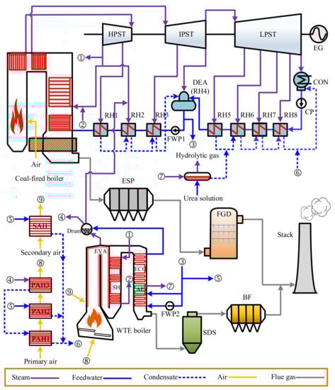 A conceptual scheme is proposed to combine the WTEU and the CFPU to use the energy from MSW, as illustrated in Figure 3. In this integrated design, most of the energy generated by MSW incineration is transferred to the steam–water system of CFPU, increasing total power generation significantly. The followings are the description of the connection between WTEU and CFPU.