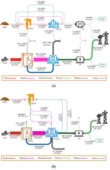 The energy analysis results of initial and proposed designs are depicted in Table 14. As the coal-fired and WTE systems are combined, not only does the mass flow of reheat steam entering the CFPU boiler increase, but the work output of STs augments as well. In addition, the consumption rates of coal and MSW keep constant. As a result, the gross power generation is increased by 3.91 MW. Moreover, the total auxiliary power is decreased by 0.33 MW because of several devices’ removals in the proposed WTE design, including condensate pump (CP) and circulating water pump (CWP). Accordingly, the net total power generation of hybrid system is improved by 4.25 MW, increasing the net total energy efficiency from 41.84% to 42.12%. Considering the power generation of CFPU is invariant, the net power generation of WTE system is raised from 8.00 to 12.25 MW, increasing the net waste-to-energy efficiency from 19.73% to 30.21%. Energy analysis results expose that the proposed design improves the thermal efficiency of WTE system.