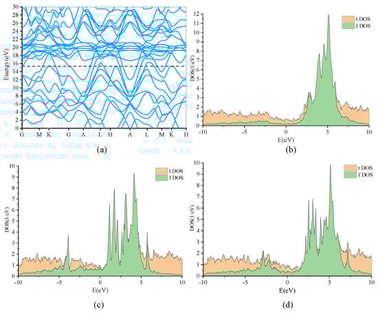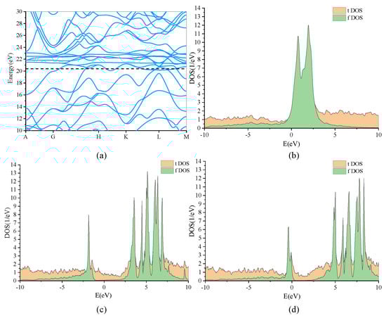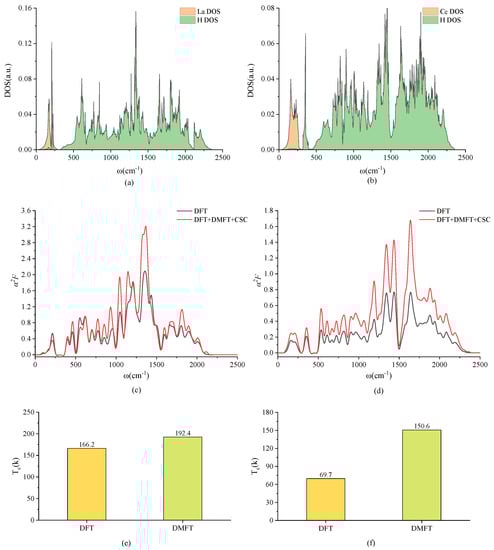 We report in Figure 4 the DFT+DMFT+CSC framework applied to CeH in the P6/mmm phase at 250 GPa. We attributed the decrease in to a higher f occupation, which shifts the chemical potential away from the f spectral features present near the Fermi level (see Figure 4c,d). Furthermore, Figure 4b shows that there is no obvious sudden change at the Fermi level, but there is an obvious mutation at the Fermi level in Figure 4d, which is around 7(1/eV); the correction of DMFT greatly affects the Tc of Ce.