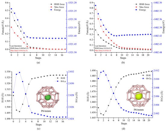 Structural relaxation of clathrate lanthanides with many-body corrections. We report the structural relaxation of the LaH (a,c) and prototype CeH (b,d) compounds. All calculations are performed at 250 GPa. The volume density is obtained by the equation of state in DFT+DMFT+CSC that provides very similar results to PBE (not shown). Internal coordinates are relaxed with DFT+DMFT+CSC, building upon the recent implementation of DFT forces for ultra-soft pseudo-potentials. We report the forces and total energies obtained during the structural optimisation, respectively, in (a,b) for LaH (CeH). Convergence is obtained within 25 iterations. The shortest H–H and Ce–H bond lengths increase throughout the structural optimisation (see c,d for La and Ce hydrides, respectively).