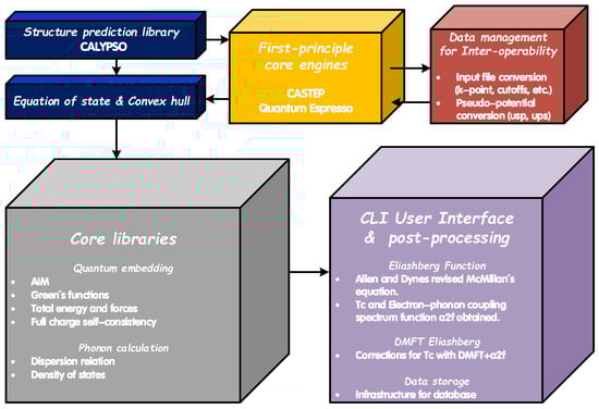 Figure 5 depicts our theoretical approach. We present a schematic overview of the theoretical platform’s principal elements and their interrelationships. Our method establishes a modular framework for high-pressure material screening. Firstly, Crystal structure AnaLYsis by Particle Swarm Optimization (CALYPSO) provided the stoichiometric compositions via Gibbs enthalpies for the equation of state and convex hull [23]. Inter-operability between Quantum Espresso (QE) [24,25] was accomplished through input file format conversion, pseudopotentials, and -point grids. The many-body corrections were provided by core libraries via the DMFT quantum embedding, which resulted in corrected forces [22] and total free energies [26,27].