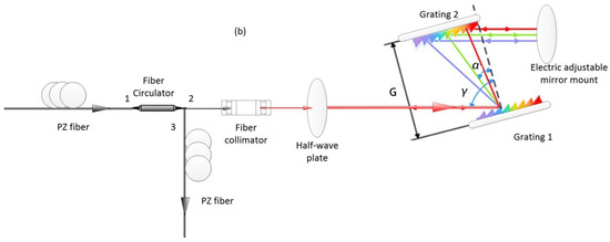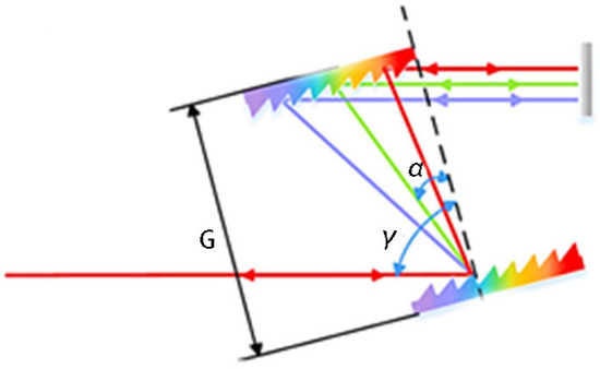 The principle of parallel grating-pair compensation is illustrated in Figure 1. The incident light was dispersed by the grating. By selecting an appropriate incident angle and grating parameters, the long-wavelength component takes longer to pass through the grating pair than the short-wavelength component. Thus, the long-wavelength component is output after the short-wavelength component on passing through the grating pair; in other words, a negative GVD is introduced to offset the positive GVD introduced by the transmission fiber to realize compensation. As shown in Figure 1, is the angle of incidence, is the angle of diffraction, and G is the vertical spacing of the grating pair. The path of a monochromatic light with a frequency component in the grating pair is [23]