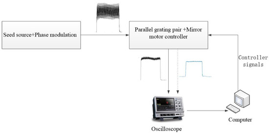Typically, d is constant and G is an inconvenience adjustment. The slight non-parallelism introduces a spatial chirp, which is detrimental to subsequent coupling. The most appropriate method to regulate compensation dispersion is to adjust the two-dimensional orientation of the plane mirror to alter the diffraction angle. However, manual adjustment is not sufficiently accurate nor efficient, and cannot be applied using adaptive feedback. Hence, an electric adjustment is required for precise tuning and active closed-loop feedback compensation. A schematic of the active closed-loop feedback compensation scheme is presented in Figure 2. The pulse with phase modulation attains FM–AM after transmission, which can be reduced after compensation. The oscilloscope then collects the time –domain signal and transmits it to the computer to calculate the corresponding FM–AM depth. If the value of the depth increases owing to external interference or changes in the input light parameters, according to the recorded data, a control signal is generated by a computer program and fed back to the mirror motor control, and then automatically fine-tuned to improve the compensation results.