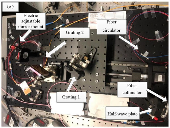 GVD compensation technology is very mature; the commonly used schemes are mainly divided into two types, including chirped fiber grating compensation and solid grating-pair compensation techniques. Among the two compensation schemes, chirped fiber grating introduces a larger dispersion, and is usually used to compensate for the long transmission fibers (several kilometers) in communication systems. By contrast, parallel grating pairs introduce a smaller dispersion and are more suitable for the GVD compensation of short transmission fibers. The length of the transmission optical fiber used in the system is 50~200 m, the dispersion coefficient is 18.7 ps2/km, and the introduced dispersion is approximately 0.94~3.74 ps2. Solid gratings are more stable and less susceptible to environmental influences than fiber gratings; therefore, the solid grating was chosen for the GVD compensation scheme.