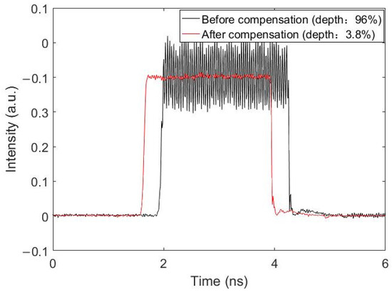 The time–domain pulse diagram obtained before and after compensation is shown in Figure 5. The relationship between intensity and depth can be expressed as Equation (6). The pulse featured a significantly large depth before the compensation for dispersion, reaching 96%. By contrast, the depth was reduced to 3.8% when employing the active closed-loop feedback GVD compensation device. We think that a depth of less than 5% is a relatively good state, which is also the standard and aim of our experiment and engineering. We can adjust other parameters to further reduce the depth, such as adjusting the grating spacing, but it is difficult to control it manually to meet the adjustment accuracy. Thus, FM–AM can be well suppressed because the compensation system compensates for the GVD of the long transmission optical fiber, and also because of the GVD introduced by the optical fiber in the seed source.