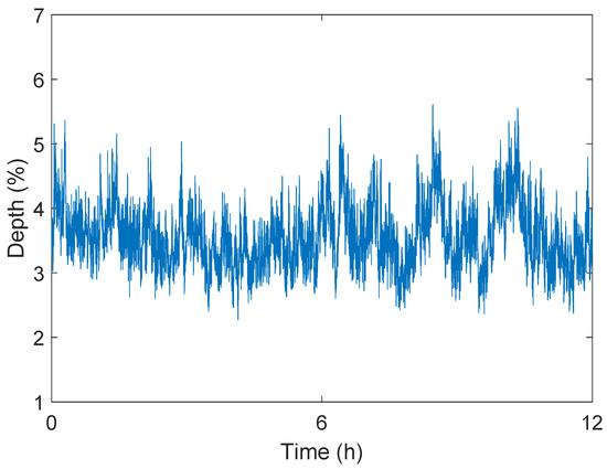 Figure 6 shows the results of the depth test over 12 h. As indicated by the graph, the depth varied between 2.28% and 5.22%. This also demonstrates the good long-term reliability of the feedback device. However, certain slight drifts of approximately 0.1~0.3% can also be detected in the graph; these can possibly be attributed to the influence of the variations in the laboratory temperature, because temperature is closely related to the dispersion of the fiber.
