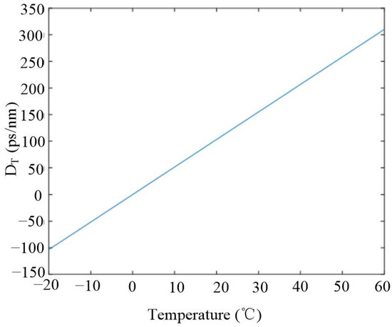 where is the dispersion parameter, n is the refractive index, a is the thermal light factor, b is the coefficient of thermal expansion, L is the fiber length, and is the wavelength. We can adopt the following parameters to obtain the curve: L = 100 m, a = 10−5/°C, and b = 5.5 × 10−7/°C. These curves are depicted in Figure 8. Based on the Equation (7), varies along a quadratic curve. However, because the thermal expansion coefficient and the thermo-optical coefficient are both considerably small, the product of the two values will be smaller, which can be regarded as a linear function, and the values of dispersion increase almost linearly with the temperature. Because of this linear variation, proportionality is used to equivalently convert the GVD and compare the variation in the FM–AM depth.