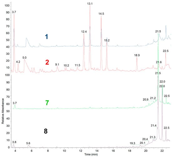 Considering the yields obtained and the more sustainable experimental conditions (economically and environmentally “greener”), the profiles of the most interesting extracts were qualitatively analyzed by UHPLC-MS, with the most relevant results shown in Figure 1.
