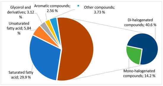 The results in Table 4, graphically summarized in Figure 4, clearly show the predominance, in this lipophilic extract, of halogenated compounds (54.8%), being 40.6% dibromine mono-unsaturated alcohols and 14.2% mono-bromine and mono-chloride compounds.