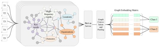 The overall architecture of the method we designed is shown in Figure 1. There are three steps from left to right. The first step is the input of news text. In Figure 1, five news texts are taken as an example. They are marked as T1, T2, T3, T4, and T5. The open-source code TextGrapher transforms five news texts into a homogenous knowledge graph. In the second step, the tensor composed of these graphs is first obtained through BERT as Service to obtain the word embedding vector of each node as the initial value of the node of the graph convolutional neural network. In the third step, we use the graph convolutional neural network and its pooling method to obtain the embedding vector of each knowledge graph and form these vectors into a graph embedding vector matrix. The cross-entropy loss function is used to train the graph convolutional neural network and update the parameters to realize the classification of news texts with different labels.
