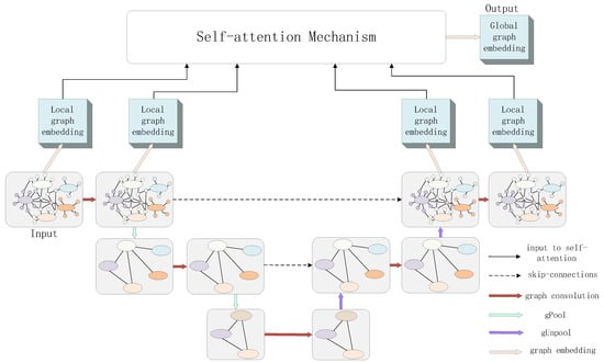 For the machine to quickly and accurately determine the class of the graph, we need a method to get the embedding vector of the graph. In the traditional method, we can reduce the size of the feature map and increase the range of the receptive field by pooling. Commonly used graph pooling algorithms such as SortPool [], DiffPool [], Graph U-Nets [], and SagPool []. Graph U-Nets refers to the structure of U-Net and designs an up-sampling and down-sampling method. It uses graph convolution and down-sampling to extract high-dimensional features, and then uses up-sampling and skip-connections to restore low-dimensional features. SagPool uses the self-attention mechanism to calculate and delete relatively unimportant nodes in the graph, aggregate high-dimensional features, and propose the concepts of global pooling architecture and hierarchical pooling architecture.