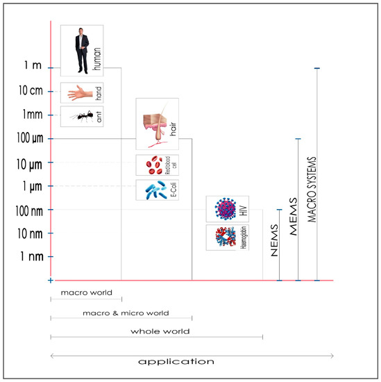 Nowadays, technology of any kind is faced with the constant need to minimalize gauges as an imperative for lowering the energy consumption and reduction in materials utilization. The most contributing aspect in this technological revolution is science. By emulating nature’s patterns, science seeks sustainable solutions for everyday human challenges. It is vital to harness biomimetic concepts to develop advanced bio-inspired devices for various applications. This article describes the potentials of biomimetic concepts for the design of future nanodevices, especially NEMS, which could have a plethora of potential applications. A practical representation of the order of magnitude of nano devices is given in Figure 1.