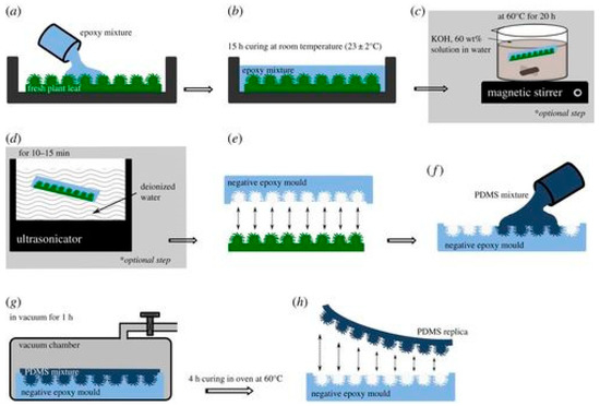 Schematic sketch of the two-step replication process: (a) Fresh plant leaf glued on a plastic Petri dish, filled up with epoxy resin. (b) Curing of epoxy mixture for 15 h to produce negative epoxy mould. (c) Epoxy sample (which adhered with leaf surface) is kept for chemical treatment in potassium hydroxide solution on magnetic stirrer (at 60 ± 3 °C for 20 h). (d) Chemically treated sample washed in deionized water using an ultrasonicator. (e) Negative epoxy mould separated from the leaf surface. (f) Negative epoxy mould filled up with PDMS mixture. (g) Degassed in vacuum chamber to remove air trapped at the interface. (h) PDMS-positive replica peeled off from the epoxy mould. Reproduced with permission [9].