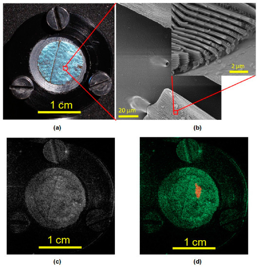 Recently, Pris et al. [38] and Zhang et al. [39] showed an interesting usage of biostructures. In their papers, the unique example of the management of thermal radiation by biophotonic structures of a Morpho butterfly is described. Additionally, the research described by Grujic et al. [40], pointed out the exciting mechanisms of thermophoresis/photophoresis within biophotonic structures, which could be harnessed for thermal radiation detection. Grujic et al. shows that, in the case of the Morpho butterfly, nature exploited natural photonic structures and their optical properties to develop IR detectors much more advanced than currently fabricated ones. Grujic et al.’s [40] experiment revealed a complex functional relationship between biological patterns and their functions. By imitating butterfly wing scales by polymer or composite materials, the thermophoretic effect can be further amplified for different sensing applications and the large-scale production of sensing devices. Polymers are particularly promising materials for infrared sensing applications because of their high IR absorption due to their organic bonds’ vibrational resonance modes and their high thermal expansion coefficient compared to metals and semiconductors [41]. Figure 5 shows a portion of a circular section of a sample, the microscopic image, and a holographic image of the investigated butterfly’s wing, accompanied with holographic reconstruction.
