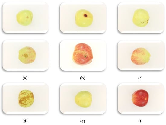 Images of healthy and infected apples with pests and diseases. (a) Apple capsid, (b) Cydia pomonella, (c) Stephannts pyri, (d) Apple rusting, (e) Healthy Golden Delicious, and (f) Healthy Red Delicious.