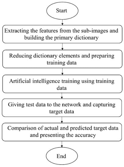 The input test image is subdivided into a series of sub-images, and the features of the sub-images are searched in the dictionary to find the sub-images similar to the test image in the input data (Figure 3). It can then be concluded that the test image tag is the same as the tag selected in the dictionary or the parameters that the sub-images of that image want to tag are close and similar to the sub-images in the dictionary. In sparse coding, the set of training sub-images is called the dictionary. Since the number of training datasets (which are the sub-images here) may well exceed the 10,000,000 samples, matching the features of the test image sub-images to the features of the training sub-images can prolong the tagging operation with a computer for hours. Eliminating similar sub-images in the training of the dataset can minimize the time for the tagging operation and does not affect the processing accuracy.