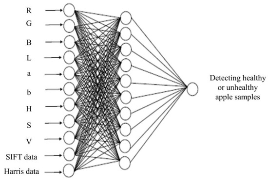 The ANNs designed in this study were multilayer perceptron networks (Figure 4). The dictionary elements were considered as training data in the neural network training phase rather than the main samples being trained to the neural network after the dictionary was created by the sparse coding. The advantage of this case is that instead of the extracted features from the sample images (images of healthy and unhealthy apples) to be used in the network training, the extracted features from the sub-images used by the sparse method were used to train the neural network. These sub-images were from healthy and unhealthy apples (each of the sub-images according to Figure 3 are 64 × 64 pixels). It is possible to deal with local minimums and overlaid results if sub-images without the sparse coding were used for the neural network training. However, using the sparse coding, only the sub-images remain whose features can be used to determine whether the samples are healthy or unhealthy. The total number of data were 2592, of which about 80% was allocated for training and the remaining of 20% was used for the test. Figure 3 illustrates the structure of a multilayer neural network. It had an input layer of 11 neurons (components), an intermediate layer (hidden layer) of 10 neurons, and an output layer of 1 neuron.