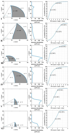 - Chen, L.C.; Low, A.L.Y.; Chien, S.F. Combinational system of a truncated ball lens and a hyperbolic lens for collimating a highly divergent source. OSA 2004, 43, 6380. [Google Scholar] [CrossRef] [PubMed]