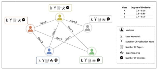 Figure 2 presents a conceptual view of the proposed network based on the aforementioned matrix where all published papers were collected for each author, including the citation number for each publication. This was followed by an extraction of the metadata for each paper (title, keywords, year). While researchers often act in various ways across multiple domains of interest, which may cause topic drift in general recommendation systems, the main research area for each author was extracted in order to determine the expertise area. Hence, while having all these factors, the similarity between the authors has been calculated based on five different factors: keywords used in published papers, publication span (based on the time from the first to the last publication), number of the published papers, total number of citations, and the degree of expertise in each area.