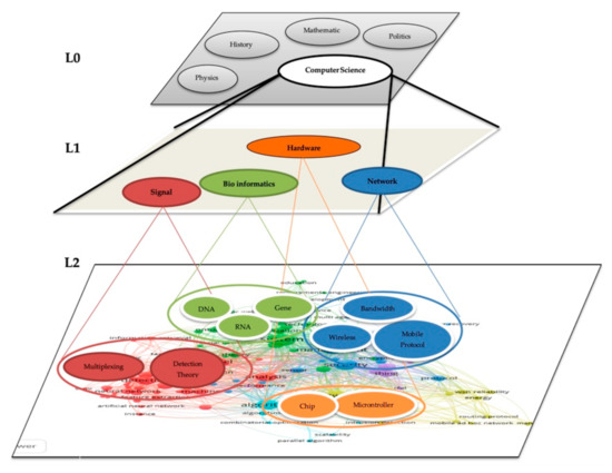 Additionally, NMF will view each paper as a mixture of various topics that are represented by a vector of weights over topics. Nevertheless, we only considered the topic with the highest weight as the main topic for that publication, which indicates the degree of the topic’s relatedness to the author’s publication. Figure 5 denotes the hierarchy of topic layers [43]. Moreover, in order to determine the similarity of the topics between the authors, the cosine similarity is employed, given that [18]: