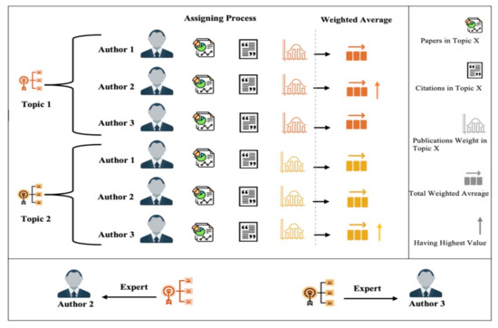 Finally, for each topic, the expertise results need to be ranked, which means that the author assigned with the highest average weight in that topic will be considered the most knowledgeable expert in that grouping. Figure 6 illustrates the process of assigning an expert to a topic, and the process for extracting the authors’ expertise is shown in Algorithm A3 (Appendix A). First, this is conducted by verifying the topic’s distribution in relation to each paper (lines 5–10), while assigning the highest topic weight as the main topic for the paper and changing the topic distribution into a vector format is the next step; this is where 1 stands in for the main topic and 0 represents the other topics (lines 11–18). Therefore, for each author, the number of papers in each topic is accumulated and their citation number is also aggregated (lines 20–32). While the total weight of the topics for each author is given, the three factors are computed while giving the topic weight the highest priority (lines 24–28). Finally, in relation to each topic, the author with the highest weighted average is highlighted (lines 29–32).
