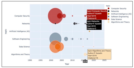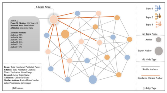 Similarly, this logic can be applied to all other domains of science, technology, the humanities, and anywhere research work is applied [4]. However, to keep track of the expertise in an academic community, researchers are diligently trying to automate this problem within this domain. By processing the content of published research papers, several theories have been proposed to extract the expertise of authors. We have reviewed the existing approaches in [5], where a few have focused on query matching using keywords [6], while others have focused on the number of citations [7] or extracting and categorizing scholarly articles using their abstracts [8]. On the other hand, some research has concentrated on mining the relationships of authors with the aim of finding the most suitable collaboration based on the similarities between them; for example, studies have inspected likenesses in terms of venues and topics [9], co-word and co-citation similarity [10], the topics used and the academic rank of collaborators [11], or the demographical data of their topics [12]. Consequently, information visualization is a valuable methodology for organizing data with higher volumes and providing accurate computations, especially for a scholarly network. However, this field is still progressing, and researchers are attempting to make the task more efficient, less time-consuming, and less complex.