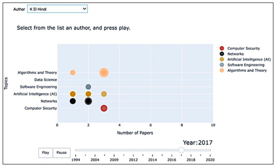 - Identifying the expert author in a specific research area relying on the multi-factor indicators for a topic of interest: total number of publications in the expertise area, total number of their citations, and total topic weight in terms of an author’s publication-based topic distribution.
