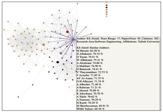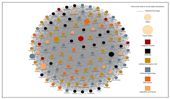 Static graphs are useful for presenting network structures, yet they restrict the amount of information that can be expressed and thus view the network from the same perspective all the time. Owing to that, in this research, we employed an interactive network to present the predicted collaboration with more flexibility and functionality. The following subsections will illustrate two interactive networks: the authors’ network and the universities’ network. The purpose of this is to present the predicted co-collaborative relationships but with different factors in each instance, as both the authors’ relationships and the universities’ co-collaboration will be analyzed.