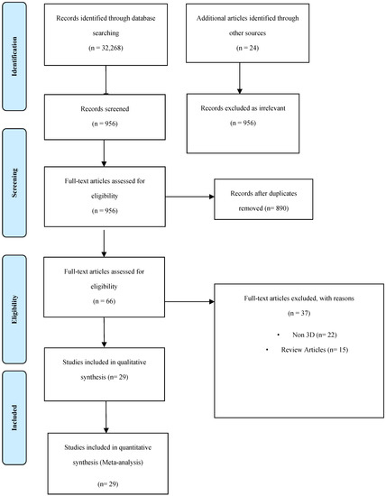 After screening the titles and abstracts of 102 unique papers, 66 potentially eligible articles were selected. Two researchers independently reviewed each title and abstract, and the obtained information was compared. Inter-examiner disagreements were resolved in a consensus meeting. Of the 66 potentially eligible articles, 37 were excluded. These articles were excluded for the following reasons: non-3D (n = 27) and systematic review and review articles (n = 15) (Figure 1).
