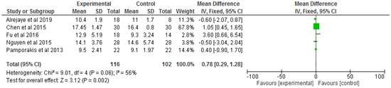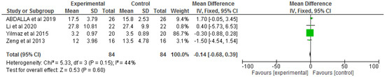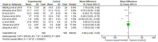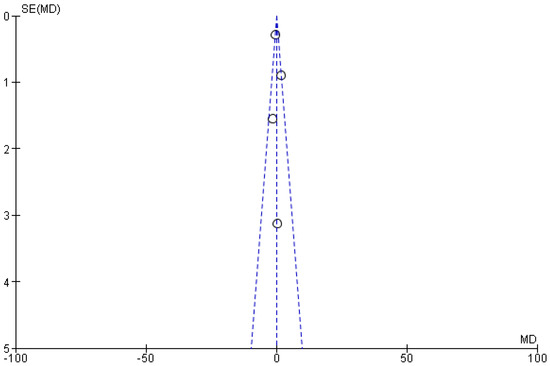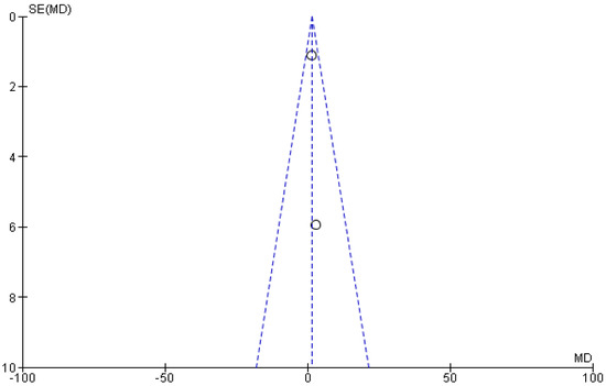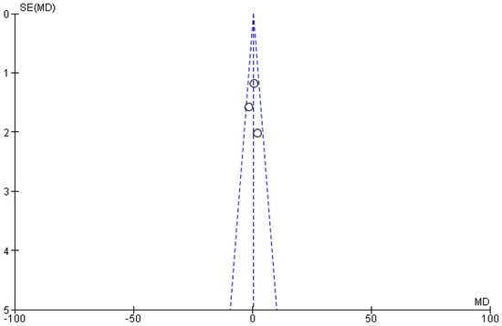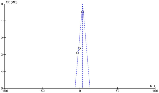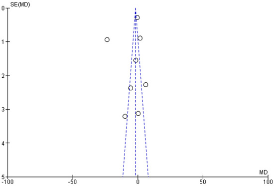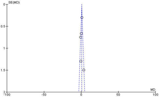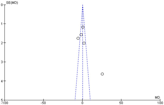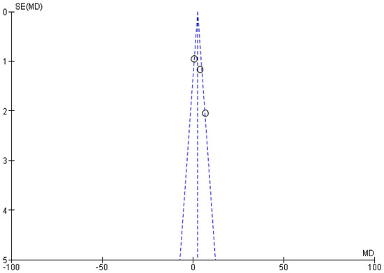 RevMan 5.3 analysis software (http://ims.cochrane.org/revman (accessed on 11 January 2022)) was used for conducting the meta-analysis (Cochrane Collaboration, Copenhagen, Denmark). Data related to the Mean Difference (MD) from various studies were estimated using the inverse-variance method. Two-sided 95% confidence intervals (95% CIs) were computed by using the fixed-effect model. The proportion of variability that attributes for heterogeneity was assessed via Cochran’s Q-statistic and I2 statistics. A fixed-effects model was used when heterogeneity was low (I2 < 50%) and, when I2 was >50%, a random-effects model was used. Funnel plots were employed for the detection of publication bias, and bias is revealed if the plots are asymmetrical. A value of p < 0.05 was considered statistically significant. Sensitivity analysis was performed to evaluate the robustness of the meta-analysis by removing outliers from the analyses with publication bias.