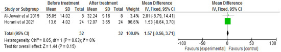 Two studies reported the Meta analysis for clear aligners between before and after treatment. The pooled analysis showed no effect on the clear aligner between before and after treatment (MD = 1.57, CI −0.56,3.71; Chi2 = 0.05; I2 = 0%, p = 0.15 > 0.05). Heterogeneity between the two studies is low (I2 = 0%). Test for overall effect: Z = 1.44 (p = 0.15) (Figure 4 and Figure 5).