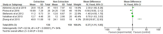 Five studies report the Meta analysis between extraction and non-extraction. The pooled analysis showed no effect on extraction and non-extraction (MD = 0.37, CI −1.11,1.85; Chi2 = 62.54; I2 = 94%, p = 0.62 > 0.05). Heterogeneity between the five studies is high (I2 = 94%). Test for overall effect: Z = 0.49 (p = 0.62) (Figure 6 and Figure 7).