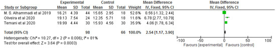 Three studies report the Meta analysis for functional appliance between the experiment and control group. The pooled analysis showed a significant effect on functional appliance between the experiment and the control group (MD = 2.54, CI 1.17,3.90; Chi2 = 10.27; I2 = 81%, p = 0.0003). Heterogeneity between the three studies is high (I2 = 81%). Test for overall effect: Z = 3.64 (p = 0.0003) (Figure 8 and Figure 9).