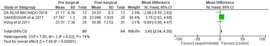 Three studies report the Meta analysis for surgery class III between the pre- and post-surgical group. The pooled analysis showed a significant effect on surgery class III between the pre- and post-surgical group (MD = 3.45, CI 2.54, 4.35; Chi2 = 7.60; I2 = 74%, p < 0.0001). Heterogeneity between the three studies is high (I2 = 74%). Test for overall effect: Z = 7.48 (p = 0.0001) (Figure 12 and Figure 13).