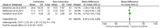 Two studies [11,12] lies outside the funnel, so removing the studies and rerunning the analysis we get three studies that report the Meta analysis between extraction and non-extraction. The pooled analysis showed no effect on extraction and non-extraction (MD = 0.37, CI −1.32, 2.05; Chi2 = 2.25; I2 = 11%, p = 0.67 > 0.05). Heterogeneity between the five studies is low (I2 = 11%). Test for overall effect: Z = 0.43 (p = 0.67) (Figure 14 and Figure 15).
