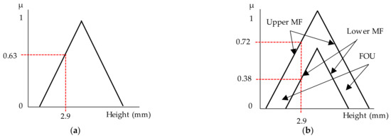 Paper [30] generalized the fuzzy set interval and defined the term IT2FLS. The requirement for secondary possibility distribution is a condition of normality, which means that the elements are fully distributed for , which are defined as follows. IT2FLS is: