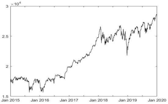 Daily stock index closing rates for the selected period January 2015 to January 2020 are used, a medium-term period of 5 years. It is also clear from the Figure 2 that this is a bullish trend or a rising trend without long-term bearish trends. The time period is deliberately ended in January 2020, before a sharp decline due to the COVID-19 pandemic situation. This is a sudden event that would significantly distort the output of the fuzzy model. Real data are processed through standard procedures applied in [36,37]. This step is purposeful, as the value of the stock index shows large fluctuations, which would not have to provide relevant outputs without pre-processing.