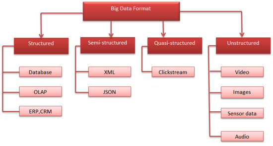 Different formats of big data are shown in Figure 1. Big data is composed of four diverse data formats, including structured, semi-structured, quasi-structured, and unstructured data formats.