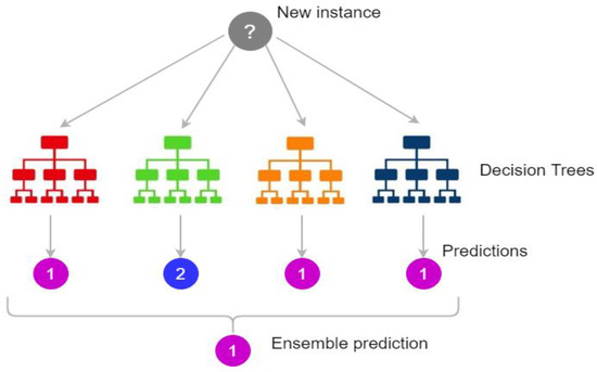 The class prediction is conducted by the majority of votes, which is defined as the most common class prediction between trees. Therefore, the voting occurs on the class probability level. The predictions select the class with the highest class probability as shown in Figure 2.