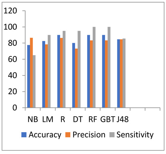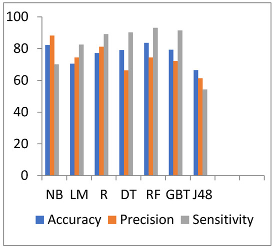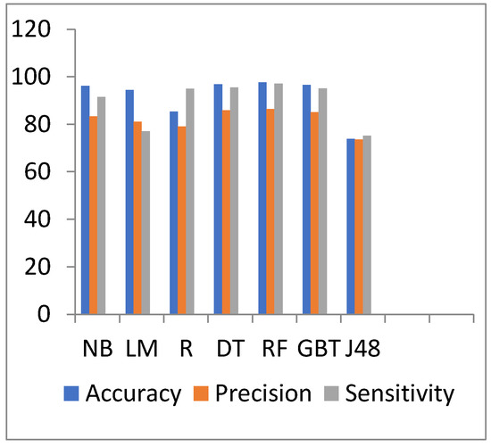 In the research by Pinto et al. [23], the J48 algorithm was used based on the chronic kidney disease (CKD) dataset. The CKD is categorized into various degrees of risk using standard markers. It is usually asymptomatic in its early stages, and early detection is important to reduce future risks. This study experimented with the cross industry standard process for data mining (CRISP-DM) methodology and the WEKA software to develop a system that can categorize the chronic condition of the kidney, depending on accuracy, sensitivity, specificity, and precision. The J48 algorithm provided the following results: 97.66% of accuracy, 96.13% of sensitivity, 98.78% of specificity, and 98.31% of precision.