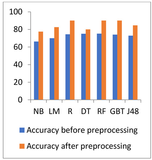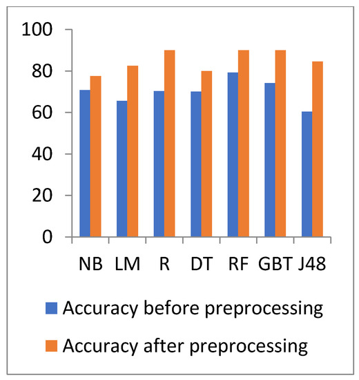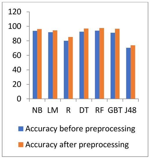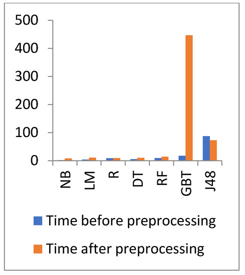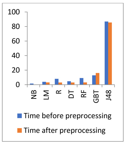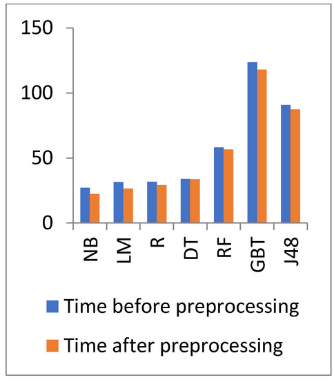 In Figure 10 and Figure 11, the results show that the accuracy after preprocessing is better than without preprocessing for all of the tested algorithms on the general health dataset. Moreover, for time processing, the time processing of the algorithms without preprocessing is longer than the time processing of the preprocessed data.