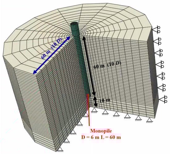 A full-scale monopile foundation in saturated sand is developed with the help of the Three-dimensional finite element model analysis software ABAQUS. The properties of the pile and sand are taken from Wang et al. []. The monopile has a diameter of 6 m, a wall thickness of 0.06 m, an embedded depth of 60 m, and a height of loading of 10 m.